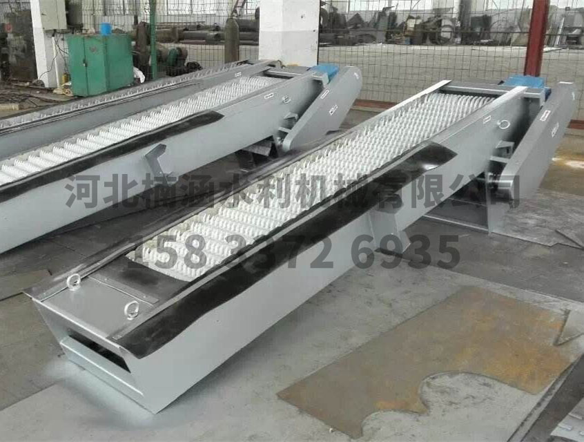 該機一般用作粗格柵使用,適用于各種市政、工業(yè)污水處理廠中用來去除污水中較大的懸浮物和飄浮物。柵條置于要架后部,若干個除污耙與物制的鏈條聯(lián)接在一起,在機架內(nèi)作回轉(zhuǎn)運動,當(dāng)除污耙經(jīng)過柵時將柵條攔截的水中污物耙出并送至機了架上方,由卸渣裝置將其從排渣口排出。