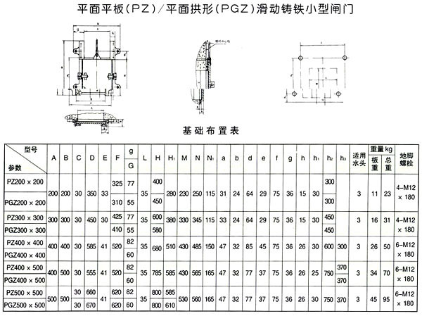 PGZ型(普通、高壓)鑄鐵閘門外形及基礎(chǔ)安裝參數(shù)表